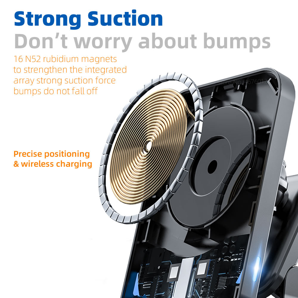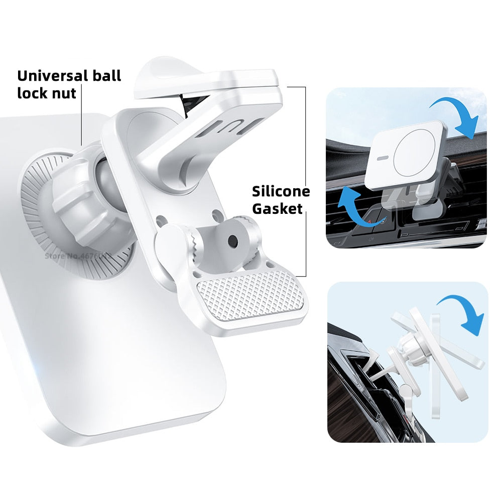 The perfect companion for busy iPhones, the Car Wireless Charger for iPhone 12 13 Series offers a 15W Fast Qi Magnetic Wireless Charging experience. Put an end to messy cables and tangled cords that make charging difficult in a hurry with this easy-to-use charger. It conveniently attaches to your car's air vent, holding your device securely in place, and the magnetic connection works with any Magsafe phone case for iPhone 12 13 Pro Mini Max, providing fast wireless charging without taking off your protective case. Plus, it's lightweight and portable, so you can take it with you when you go and charge your phone while keeping both hands on the wheel. Keep your speed and stay charged up with Car Wireless Charger for iPhone 12 13 Series when you're in the car or on the go!